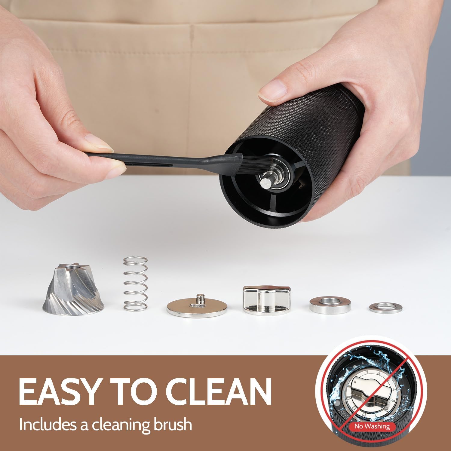 - Easy to Clean & Maintain: Quick disassembly of the manual burr coffee grinder with a simple counterclockwise twist. Use the included brush to clean with ease. Note: To extend lifespan, avoid rinsing with water