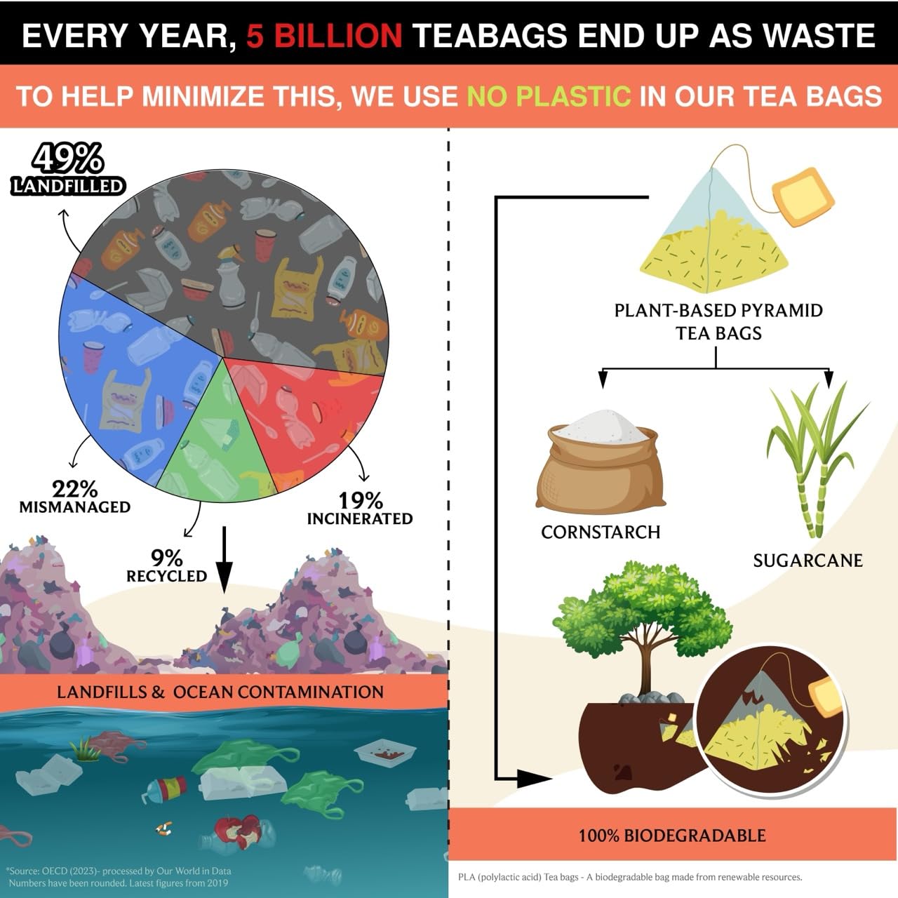 - CONVENIENTLY PACKED - The tea comes packed in pyramid bags that allow for a more fuller and intense brew as it provides ample space for the tea leaves to unfurl and infuse. We have removed individual sachets from our packaging to reduce wastage, instead the pyramid bags are packed inside a resealable pouch that can be conveniently stored or carried as a travel tea. Each pyramid black tea bag / earl grey tea bags contains 2gms of tea. Tea for one.
