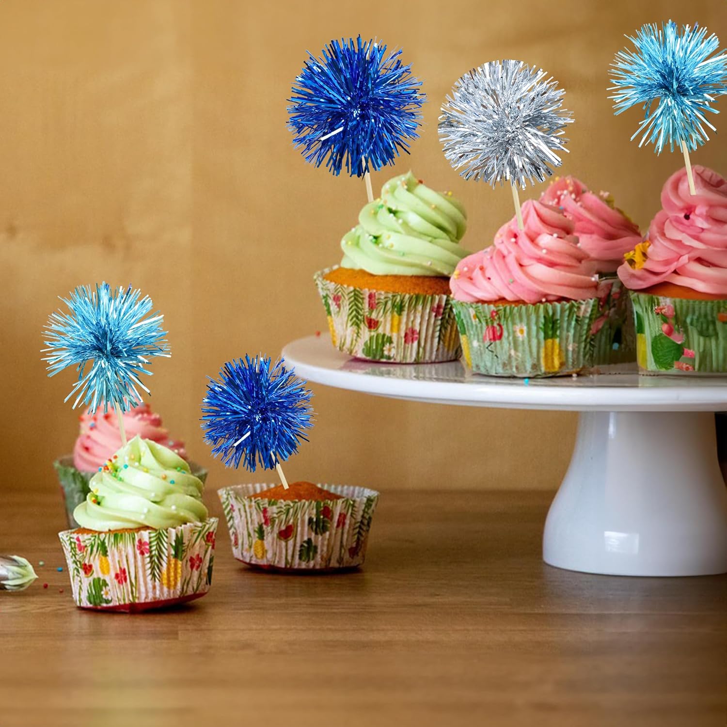 Gyufise 30Pcs Foil Firework Cupcake Toppers Sparkle Tinsel Cake Toppers Tinsel Drink Cake Decoration Cocktail Picks for Birthday Wedding Graduation Party Supplies Blue Silver
