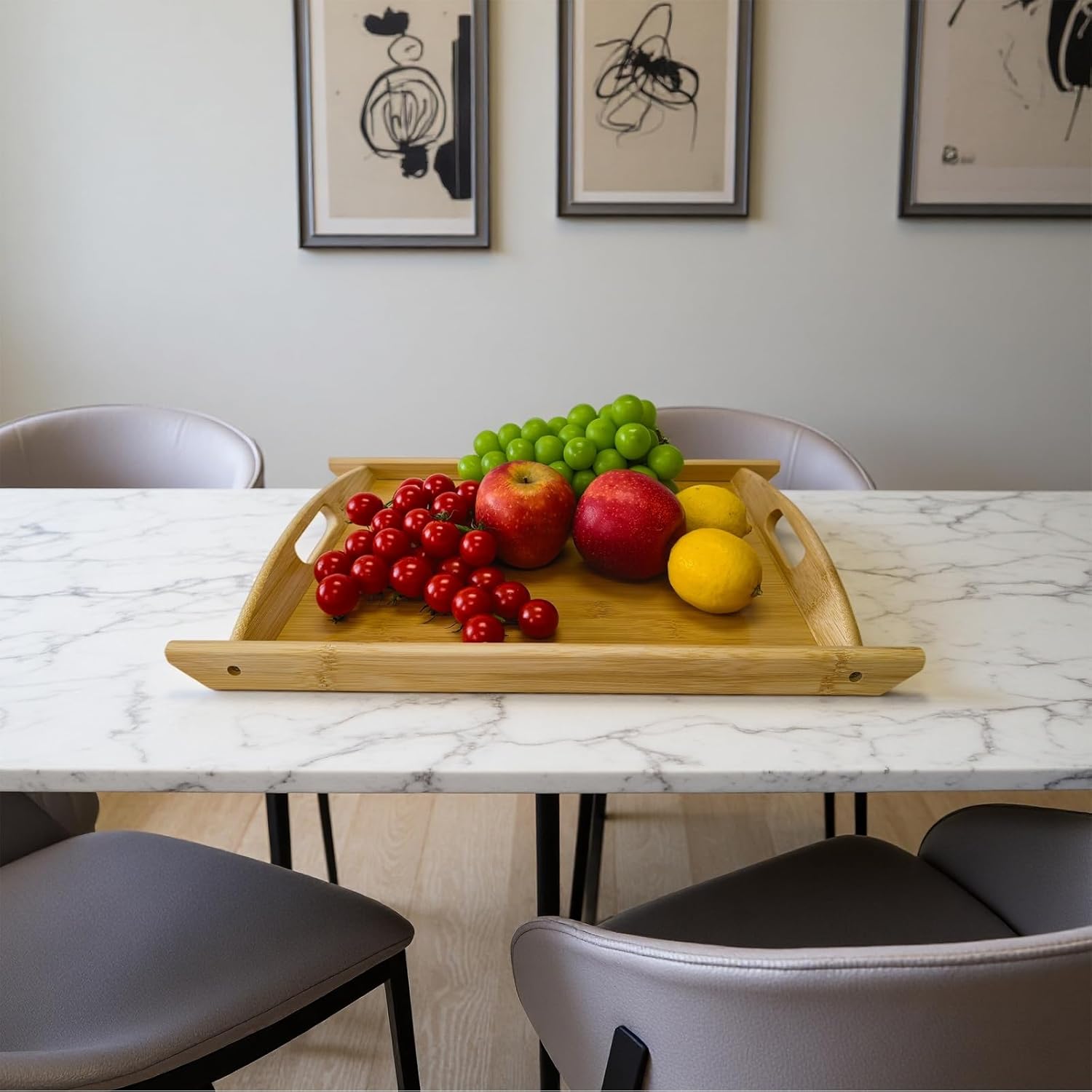 - RAISED EDGES AND HANDLES: It's elegant sides with wide handles design makes it more easy to grip and transport, allow for easy carrying of food from the kitchen to living room, patio, bedroom or bathroom; raised edge could prevent items from falling over, never worry about accidents.