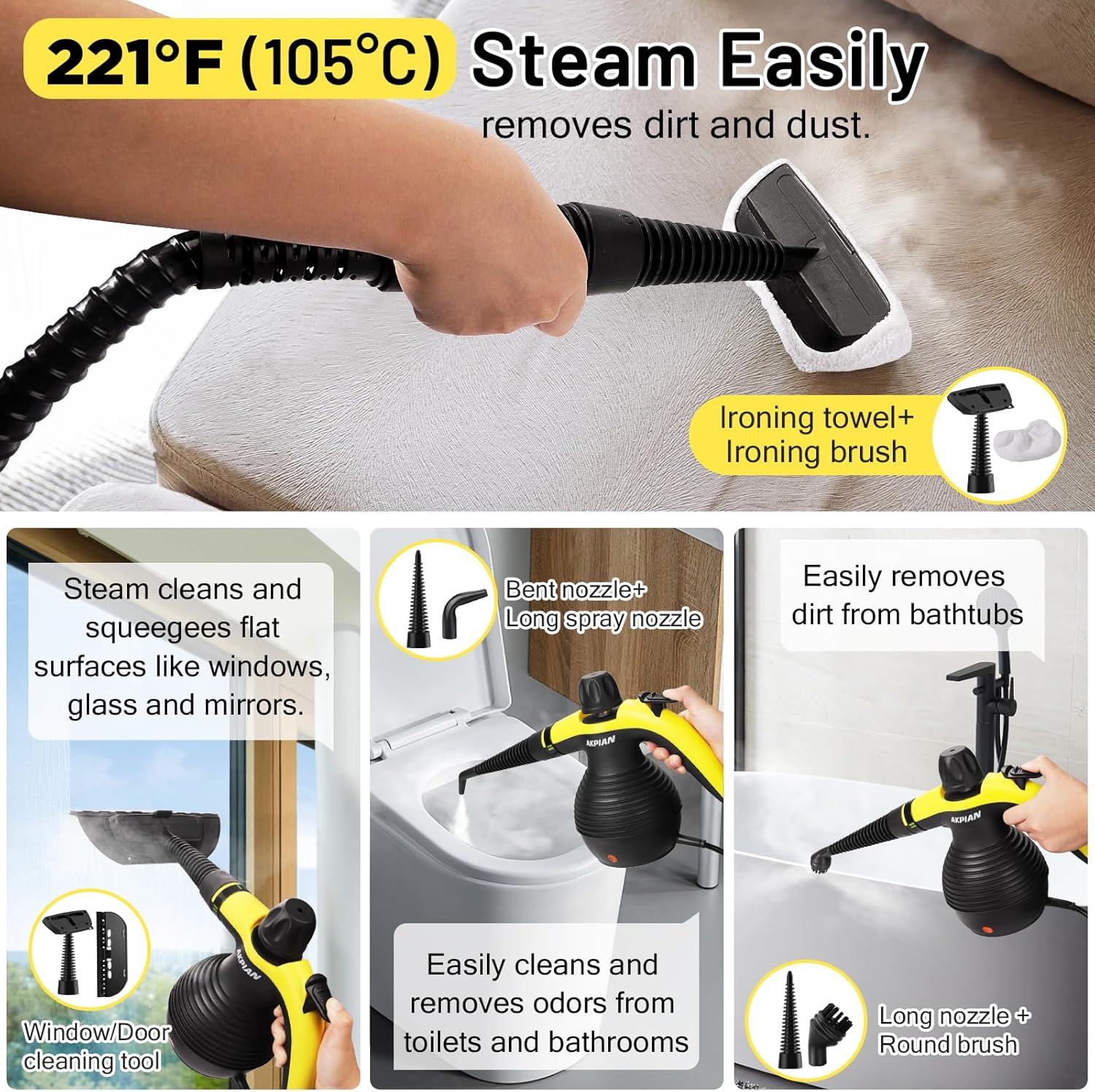 - 【10-piece Accessory Set】: AKPIAN steamers does an amazing job of cleaning and ironing. Plus 10-piece accessory kit such as: angled nozzle, bendable extension, nozzle with brush, fabric steamer tool, rubber wiper for window/door, and many other extras. It’s all-purpose and can go and clean out any hard to reach gaps, corners, angles, and also various surfaces/materials: kitchen sink, countertop, toilet, BBQ grill, shower curtains, floor, kids’ toy, pet mattress, sofa, car, and clothing.