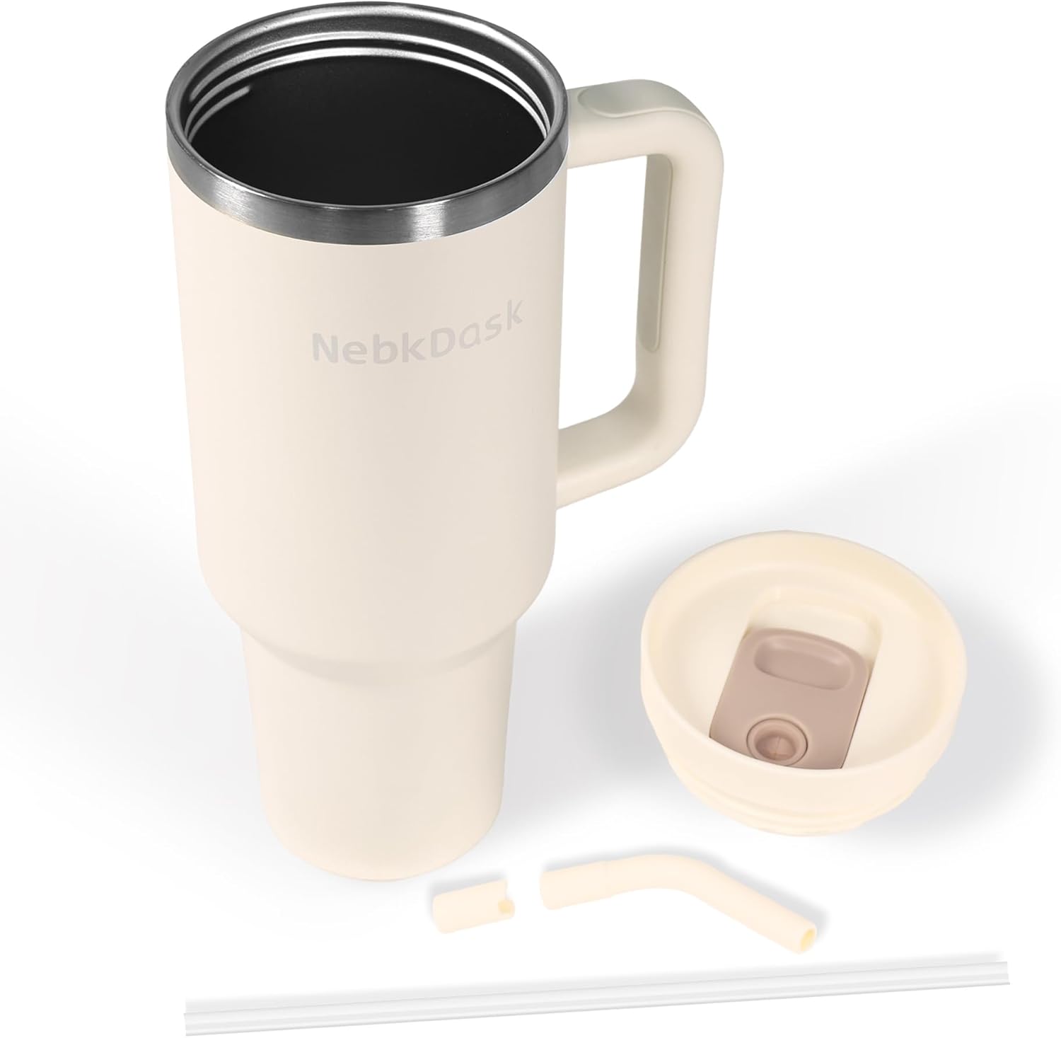 40 oz Water Bottle with Handle & Straw – Insulated Stainless Steel Bottle, Leakproof, Fits in Cup Holder – Reusable Cold Drink Thermos for Women & Men (off-White)