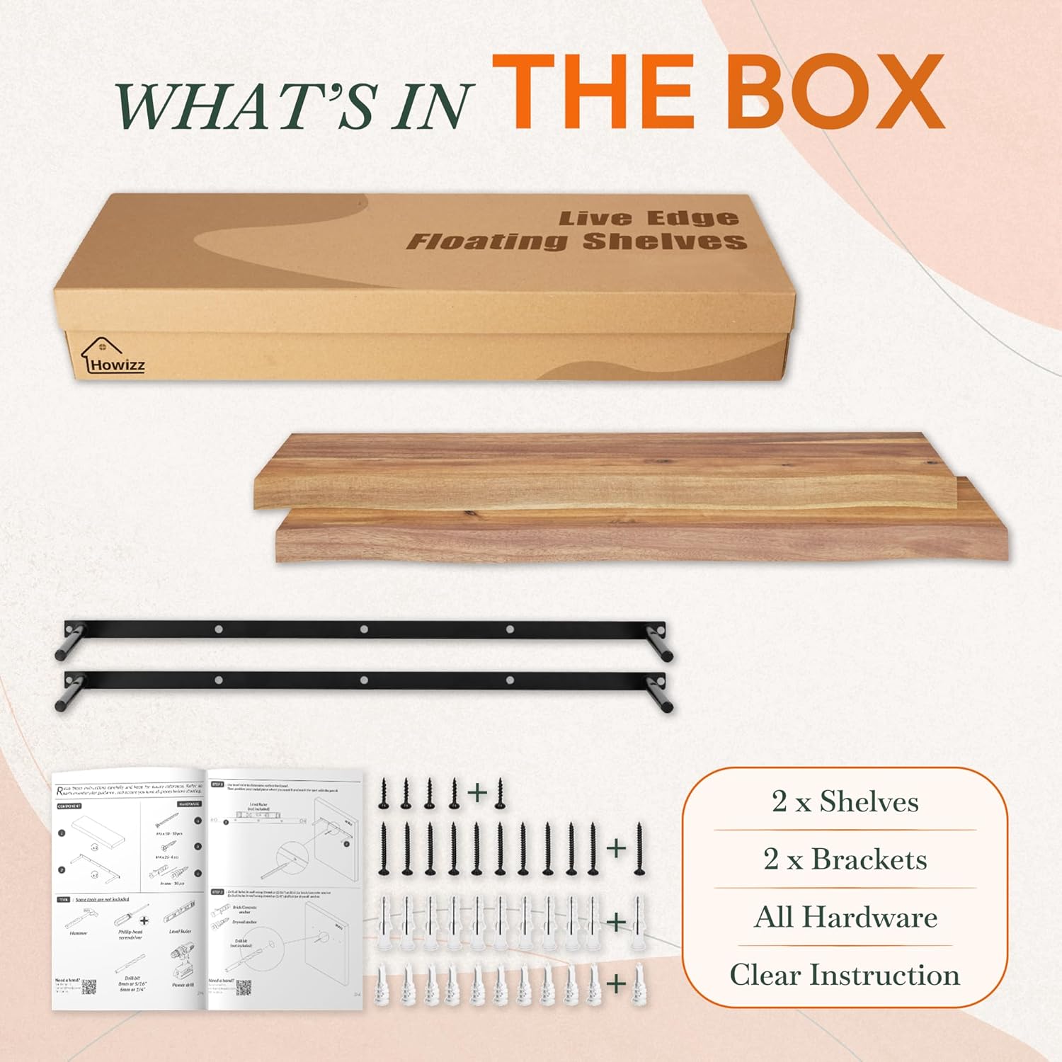 - THICK WOOD SHELF: Howizz's wall shelf is crafted from 100% acacia wood with, emphasizing its rich texture and robust durability. These live edge wood shelves will bring distinctive character to your space, offering a unique blend of vintage and modern elements.