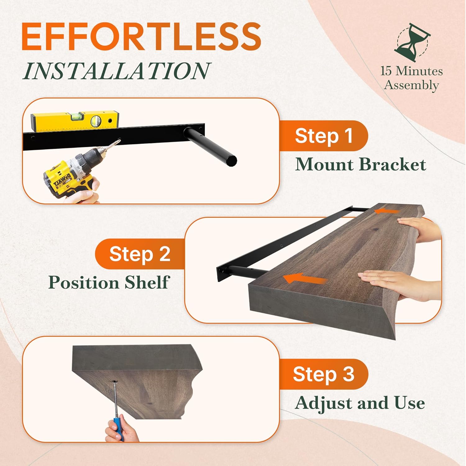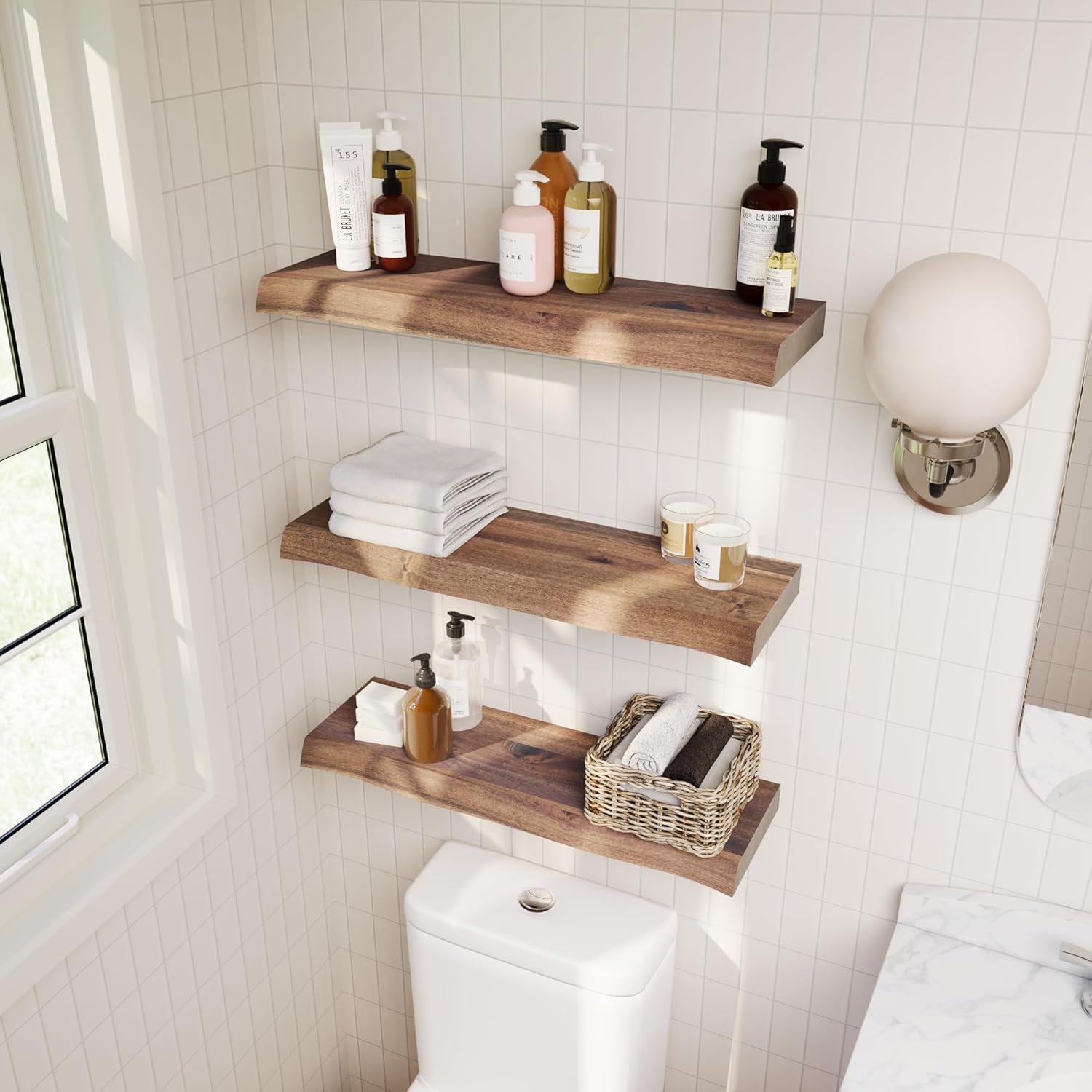 - MULTIPLE USES: Elevate your space with our versatile live edge acacia wood shelf. Well-suited for various spots like entryway, vanity, desk, or between windows. These rustic floating shelves are ideal for showcasing in the bathroom, living room, or any other area, adding both style and functionality.