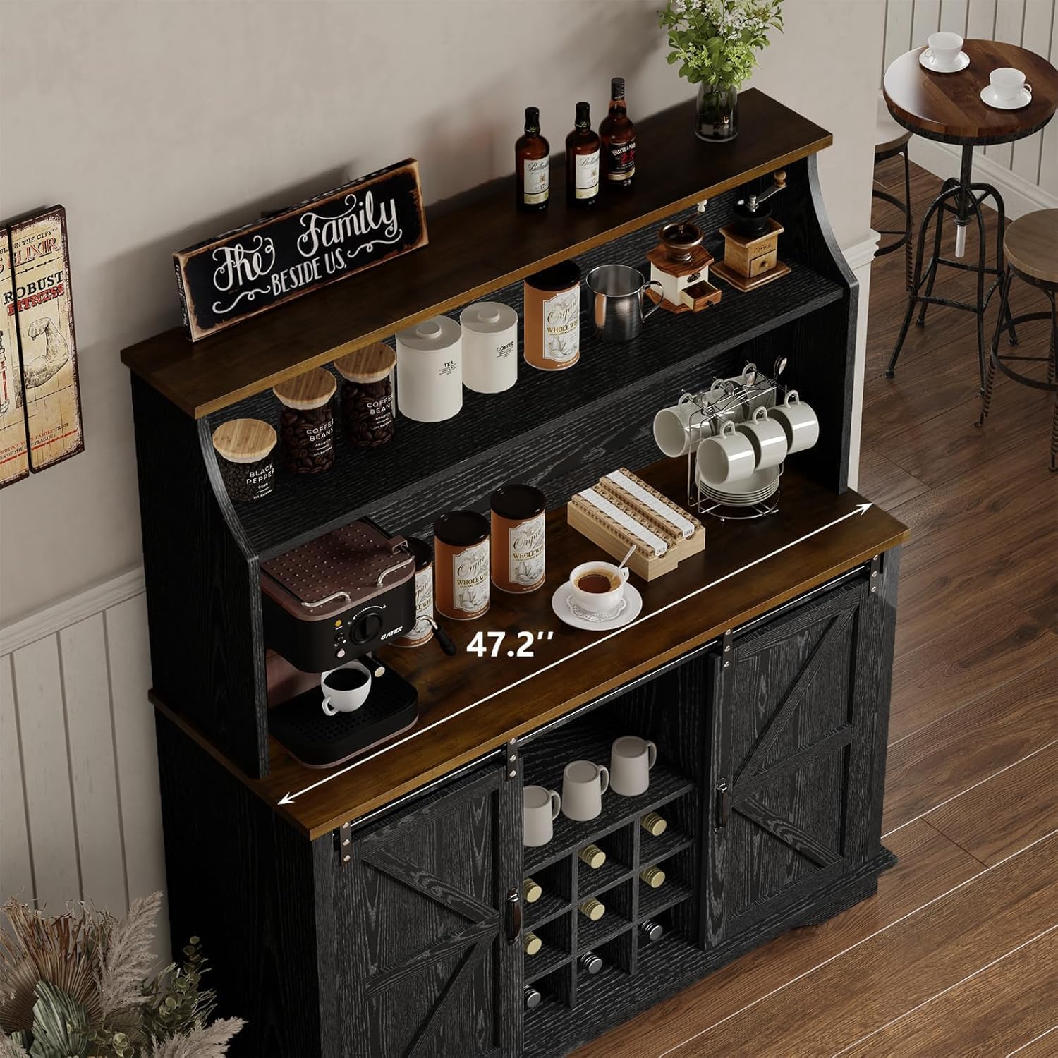 - [Farmhouse Coffee Bar Cabinet] The coffee bar hutch features curved lines top & sliding barn door design, ideal for country/industrial style homes. It's both practical and beautiful