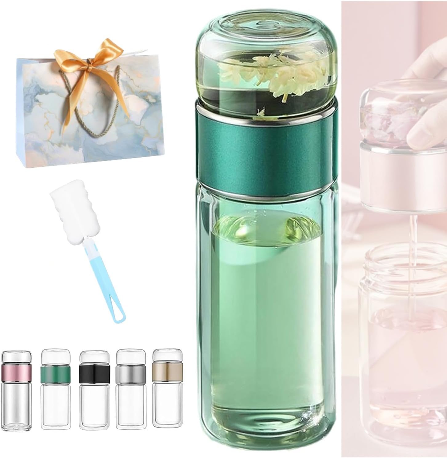 Tryteava Glass Infuser, Tryteava 3-in-1 Smart Tea Infuser, Portable Glass Double Wall Tea Infusers Bottle, with Stainless Steel Filter, Hot & Cold Brew, For Loose Leaf, Office Home (Green, 280ml)