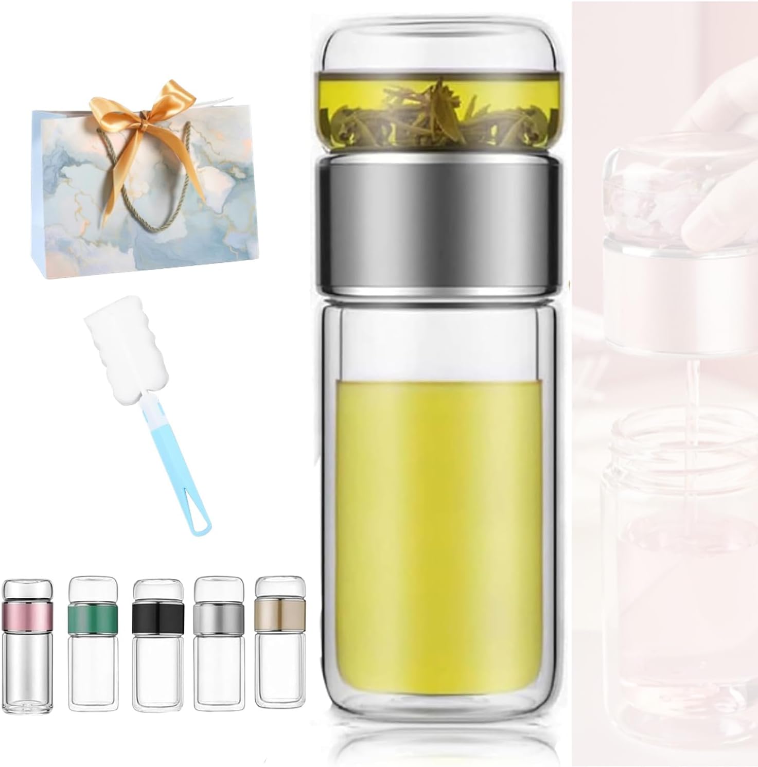 Tryteava Glass Infuser, Tryteava 3-in-1 Smart Tea Infuser, Portable Glass Double Wall Tea Infusers Bottle, with Stainless Steel Filter, Hot & Cold Brew, For Loose Leaf, Office Home (Silver, 280ml)