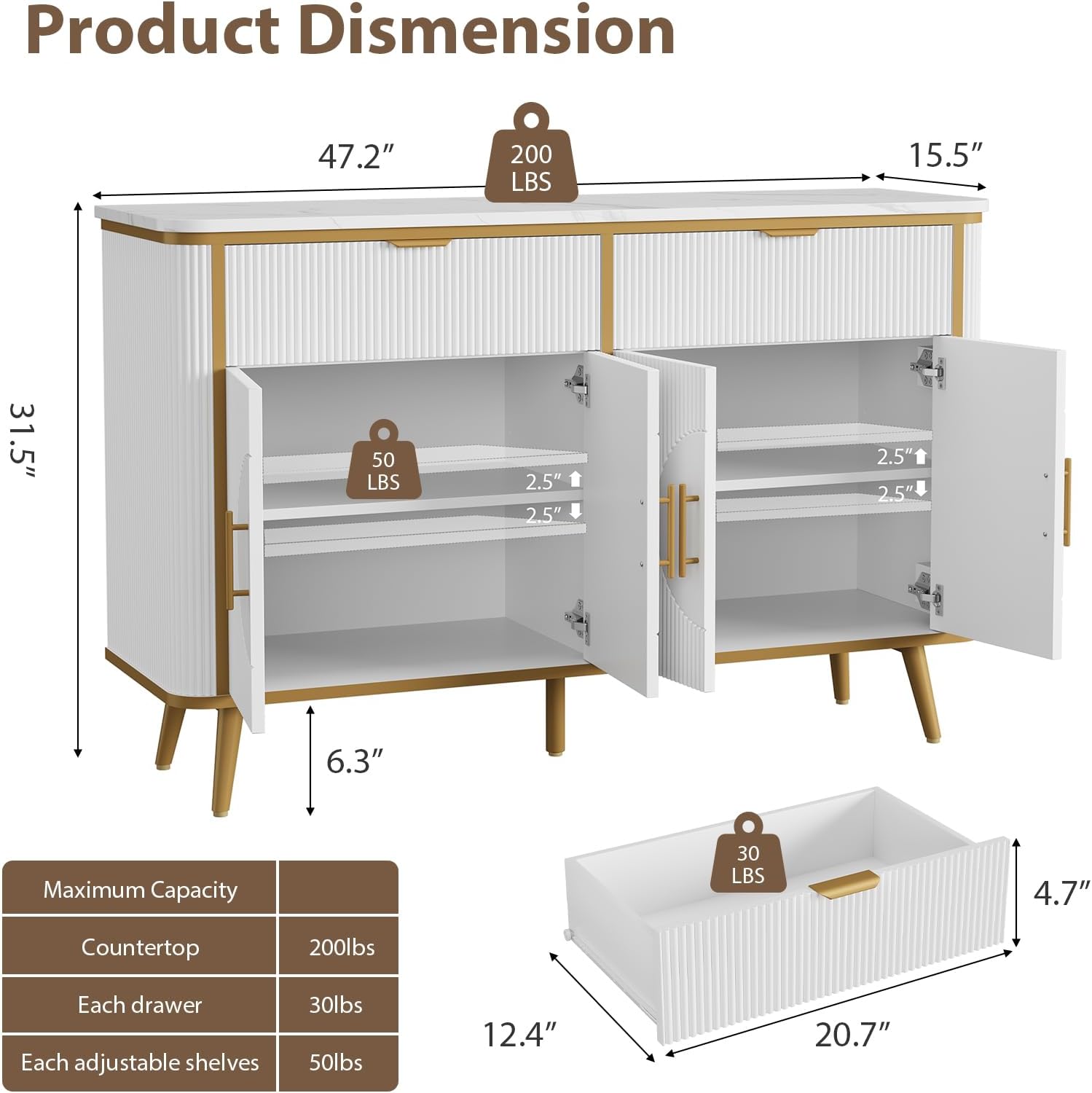 - Modern Fluted Striped Design—This chic sideboard features a unique fluted panel and curved contour design, enhancing a stereo feeling with striking geometric lines. Its exquisite designed polished and frosted handles are matched with the marble-textured finish countertop, which combines modern aesthetics with natural style, adding a touch of fashion and luxury to the room.
