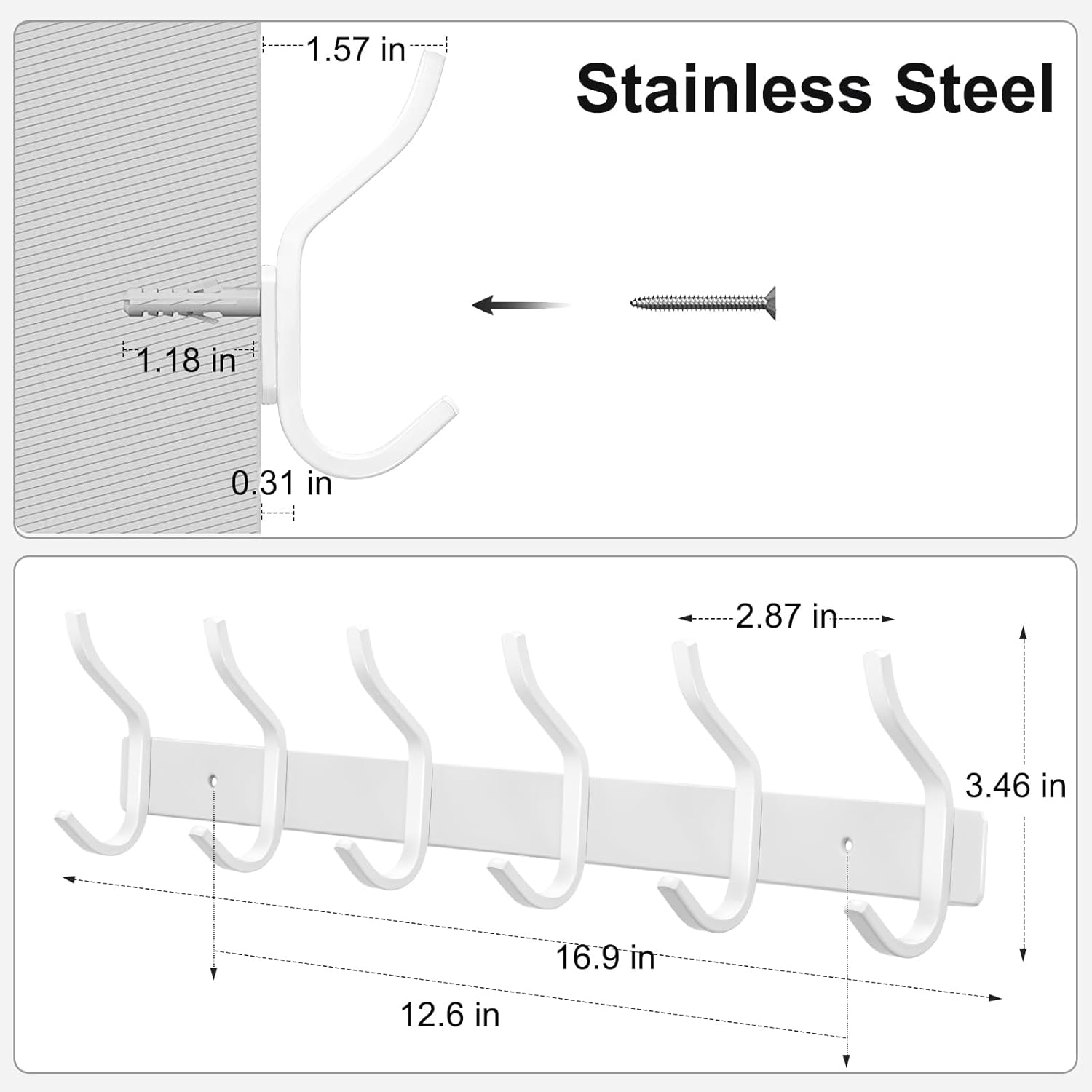 White Wall Hooks Heavy Duty, 17 Inch Coat Hooks Wall Mount with 6 Hooks, Wall Hooks Hangers for Entryway, Bathroom - for Hanging Backpack, Bag, Coat, Purse, Hat, Towel, Clothes