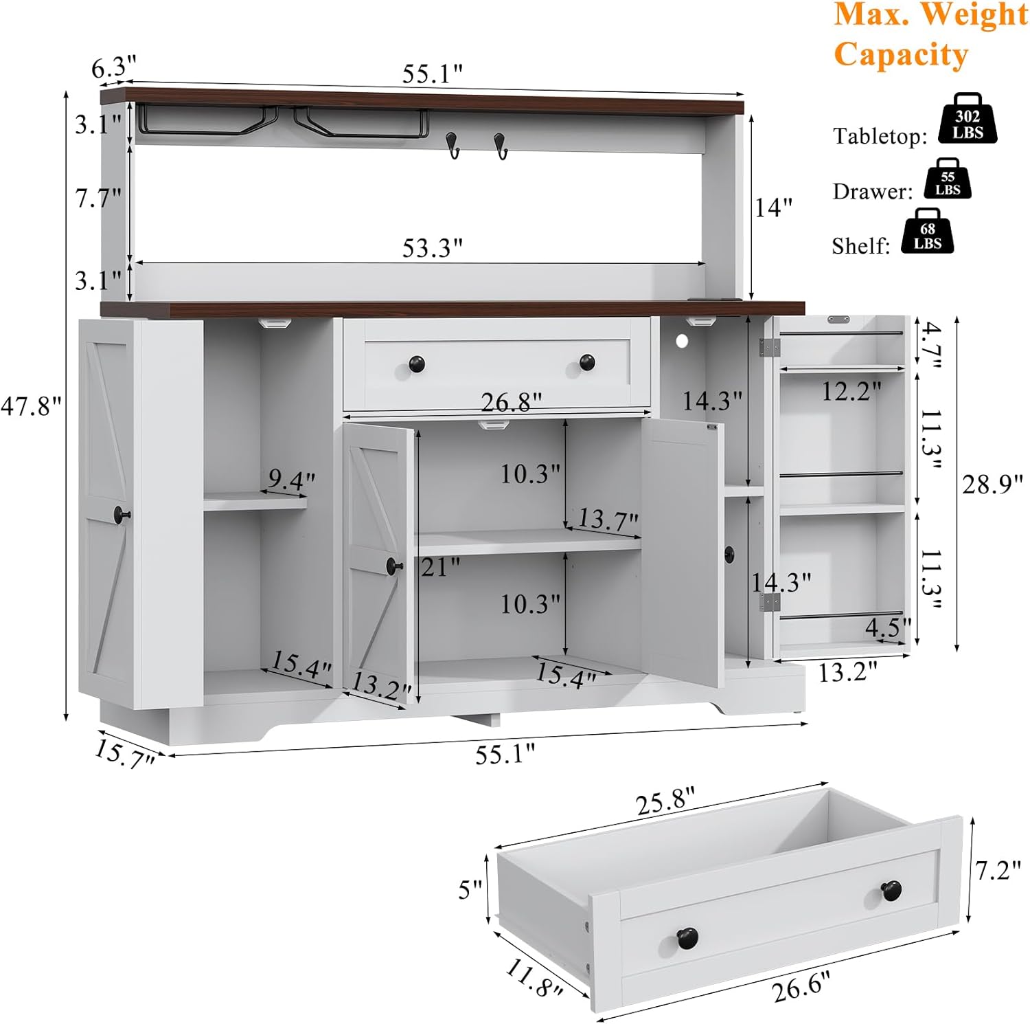 Hutch Storage Buffet Cabinet with Drawers, and Charging Station, Coffee Bar Cabinet with Barn Doors, Wine Rack and Hooks, White Wood Sideboard Buffet for Kitchen, Dining Room, 47.8" High