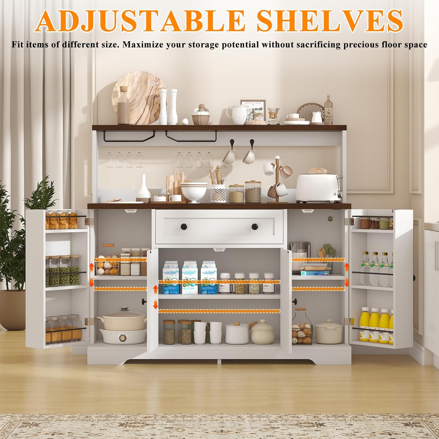 - 【Higher Weight Capacity UP TO 302 Ibs】An Special Adjustable Support Leg is directly under the center of the sideboard buffet cabinet with storage. The fifth leg can stably support the buffet, largely avoiding the shelves from bending and shaking! So our countertop and each shelf can support up to 302Ibs, 68Ibs separately!