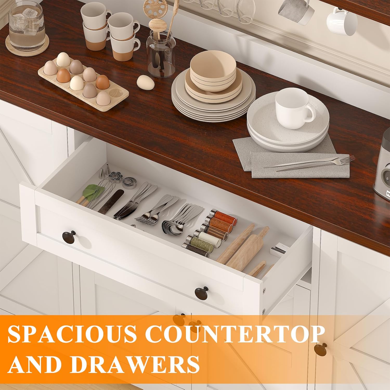 - 【Large Divided Storage】Say goodbye to clutter. The spacious countertop can accommodate coffee makers or microwave ovens. The doors withThe drawers of the coffee bar cabinet make your essentials close to hand. Bottom cabinet can easily store dishes and a side door open to reveal three racks for drinks, snacks or seasoning.