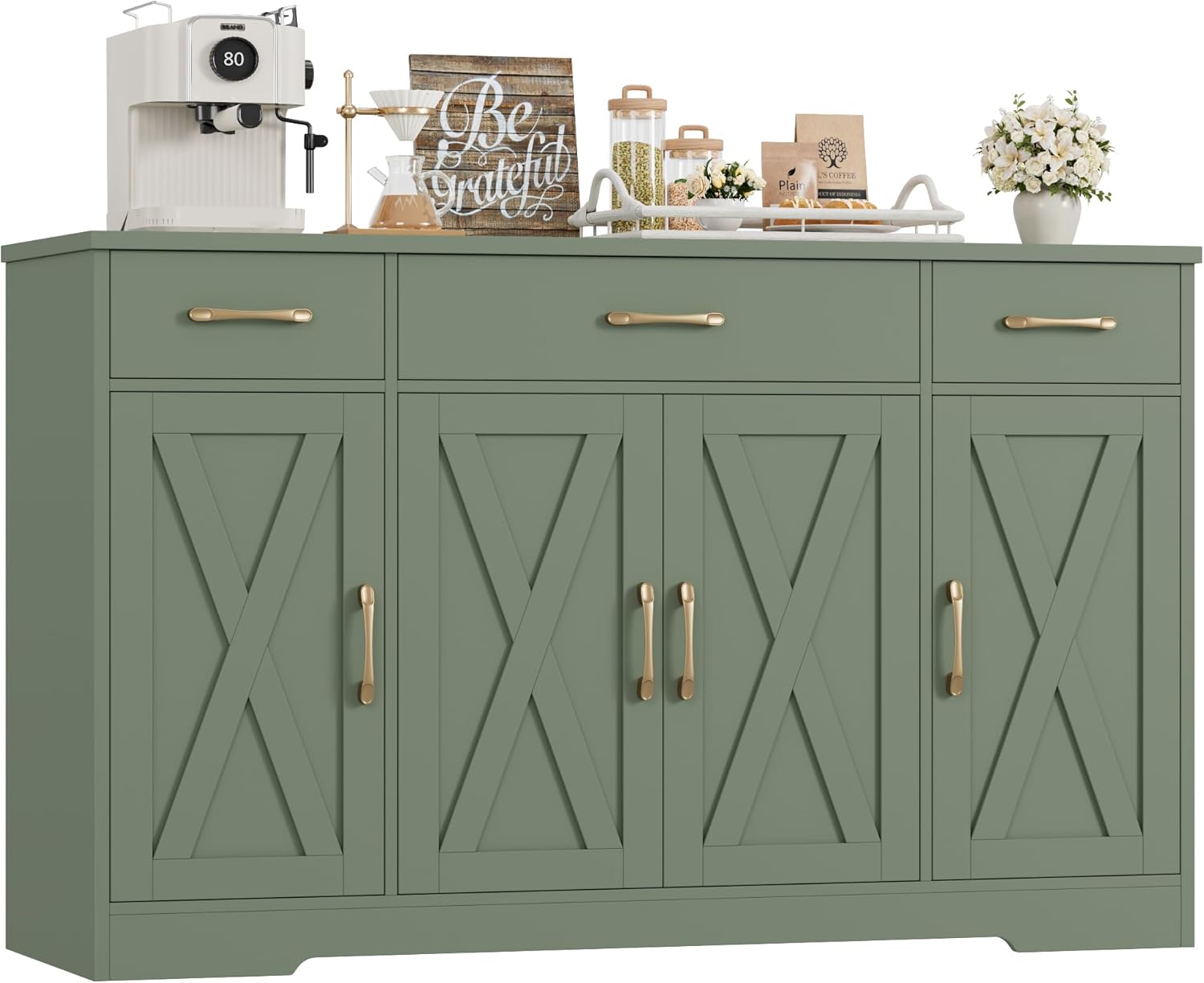 HOSTACK Buffet Sideboard Cabinet with Drawers, 55" Large Buffet Storage Cabinet with Shelves and Doors, Modern Farmhouse Coffee Bar Station for Kitchen, Dining Room, Green