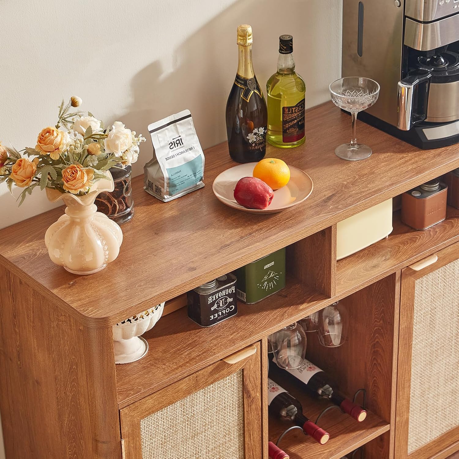 Lerliuo 47.2" Rattan Wine & Liquor Cabinet with 2 Doors, Boho Farmhouse Coffee Bar Station, Built-in Wine Racks & Storage, Adjustable Shelves for Living Room, Dining Room, Kitchen, Tea Brown