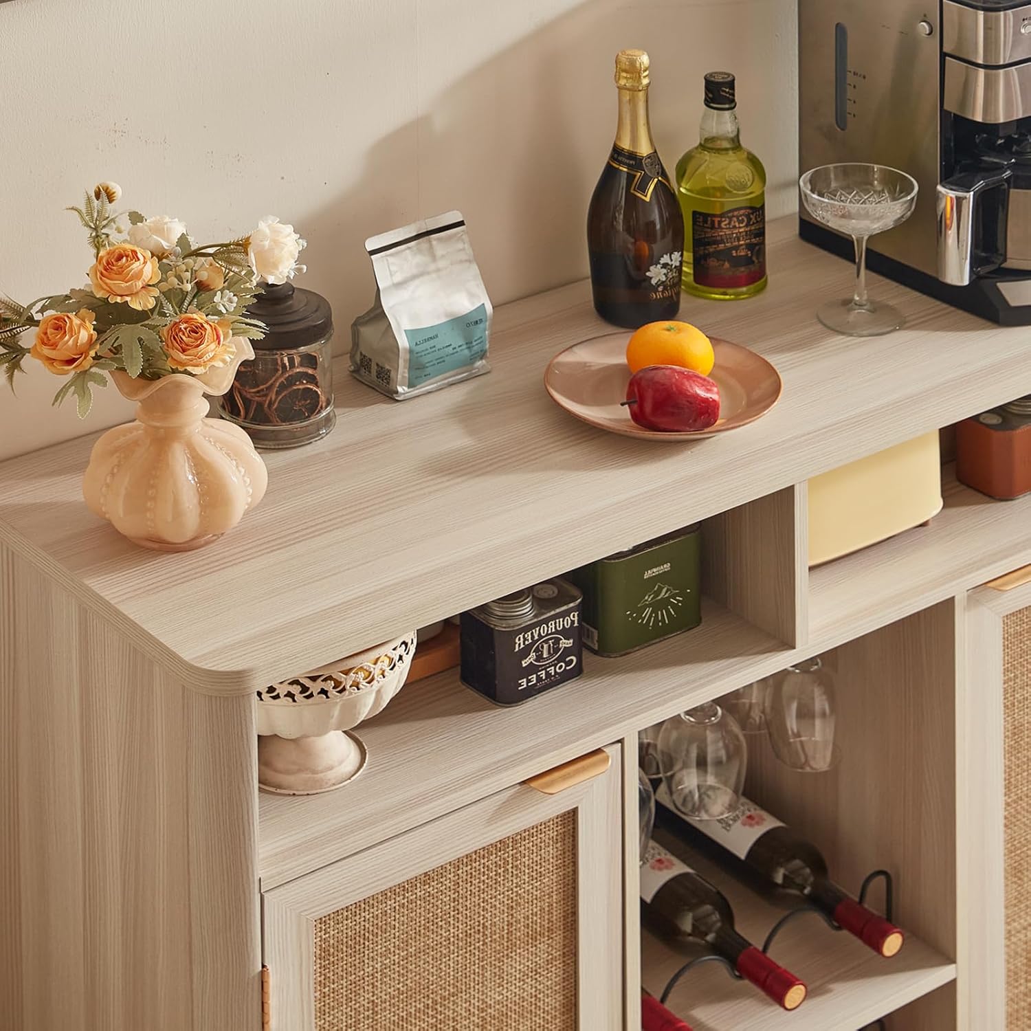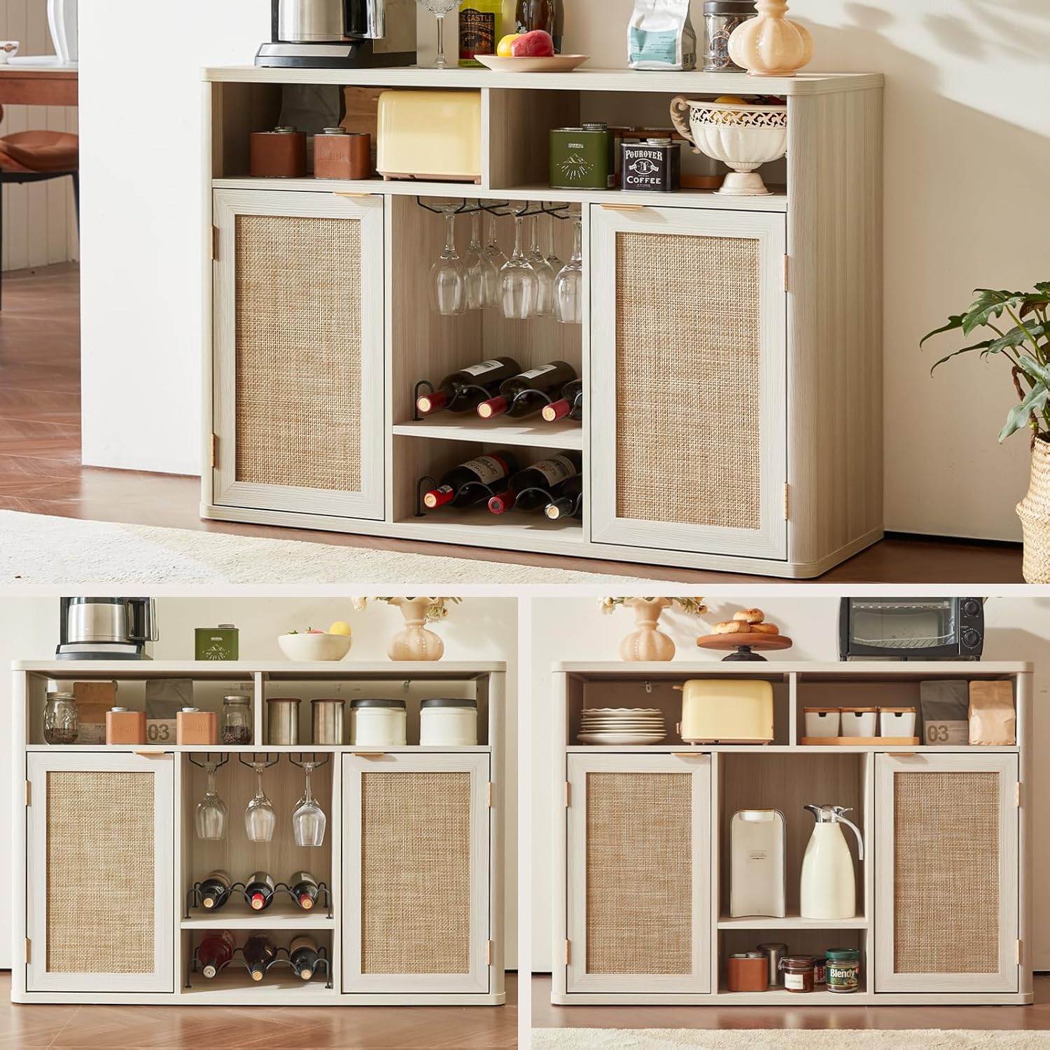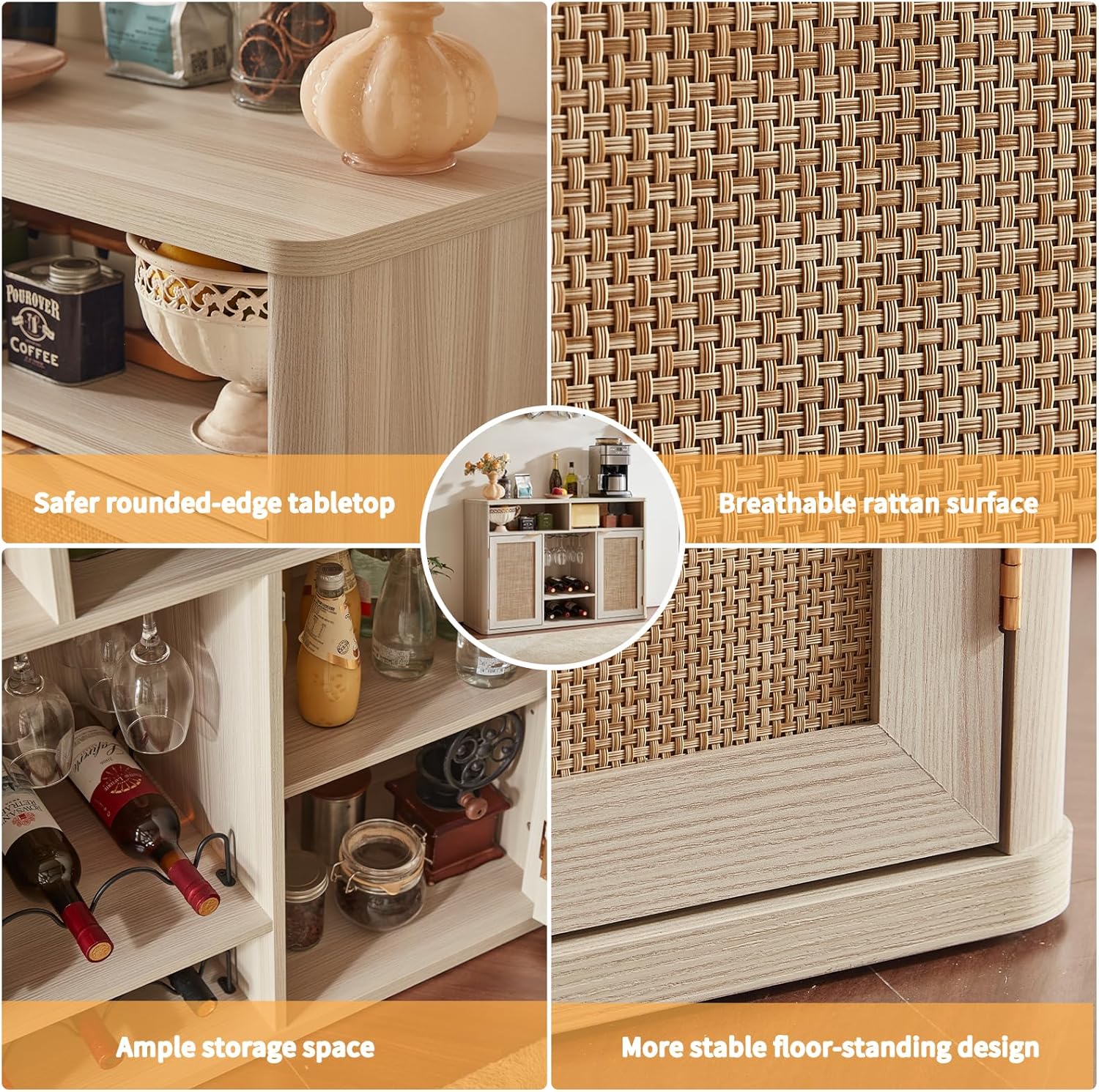- [Stylish Rattan Mesh Doors]: The grey white wine bar cabinet features decorative rattan mesh doors that add texture and character to your home. This thoughtful design brings a light, airy feel, making it suitable as a coffee bar cabinet in the kitchen, a whiskey cabinet for gatherings, or even a farmhouse buffet cabinet in the dining room.